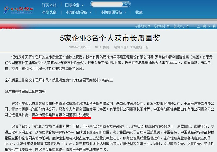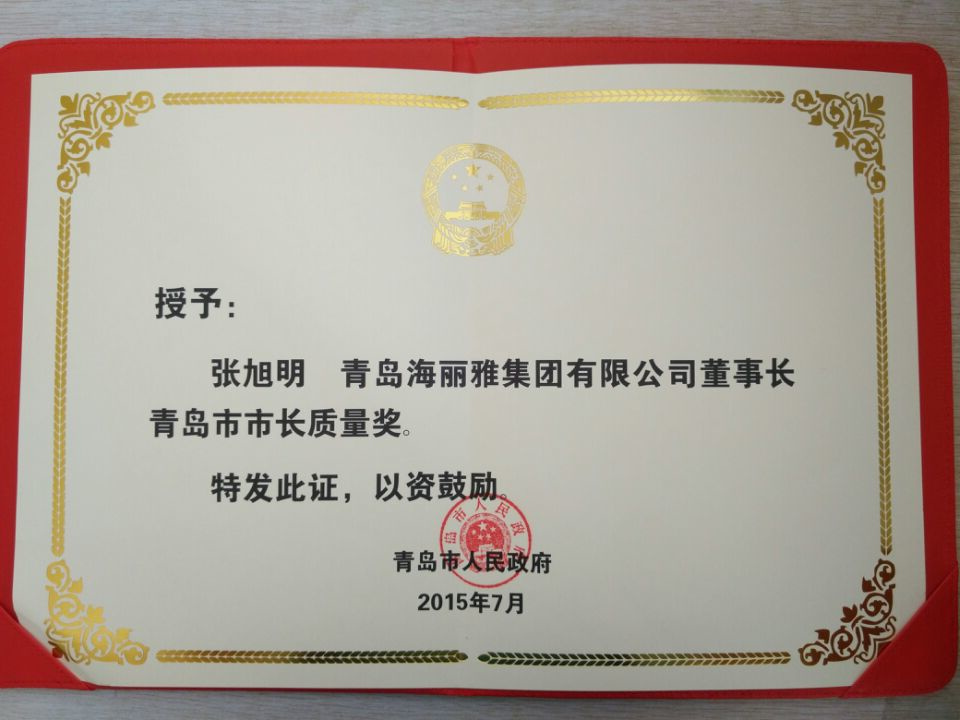 2015年7月21日,青島市人民政府辦公廳召開(kāi)全市質(zhì)量工作會(huì)議,對(duì)2014年度青島市市長(zhǎng)質(zhì)量獎(jiǎng)獲獎(jiǎng)組織和個(gè)人進(jìn)行表彰。青島海麗雅集團(tuán)董事長(zhǎng)張旭明在全市參評(píng)中,經(jīng)過(guò)層層評(píng)定,榮獲市長(zhǎng)質(zhì)量獎(jiǎng)個(gè)人獎(jiǎng)。