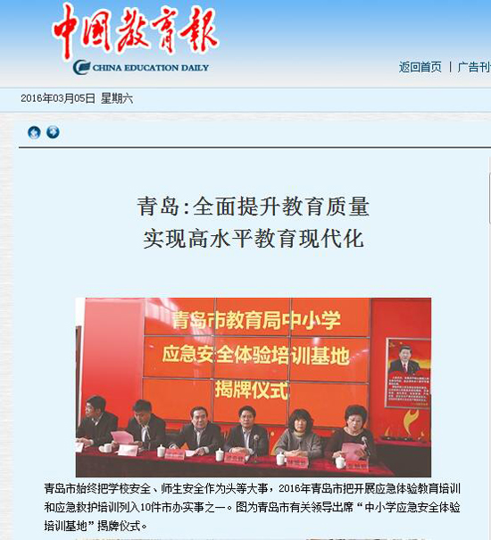 2016年青島市把開展中小學(xué)生應(yīng)急體驗(yàn)教育培訓(xùn)和市民應(yīng)急救護(hù)培訓(xùn)列入10件市辦實(shí)事,未來(lái)海麗雅應(yīng)急安全教育培訓(xùn)中心將為更多的學(xué)生、百姓提供專業(yè)化應(yīng)急安全教育培訓(xùn)服務(wù),為提升社會(huì)整體應(yīng)急自救、互救技能水平貢獻(xiàn)力量?!吨袊?guó)教育報(bào)》關(guān)注青島市應(yīng)急教育的發(fā)展,在全國(guó)“兩會(huì)”期間,第一時(shí)間將“青島市教育局中小學(xué)應(yīng)急安全體驗(yàn)培訓(xùn)基地”落戶海麗雅應(yīng)急安全教育培訓(xùn)中心消息進(jìn)行宣傳報(bào)道。