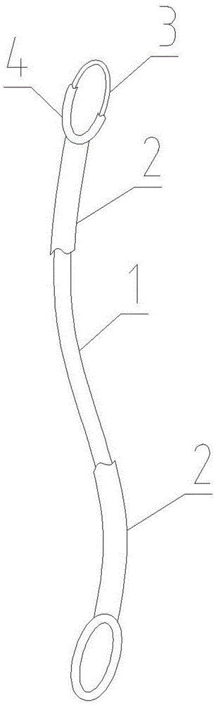 具體的生產(chǎn)時,先將很長的一整條芳綸繩擠塑聚氨酯,然后根據(jù)使用要求,截取適合的長度,將兩端聚氨酯層去掉,再在芳綸繩的兩端插接環(huán)眼3,然后將聚氨酯層外面露著的芳綸繩和環(huán)眼3涂上聚脲樹脂4。