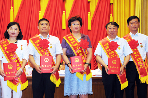 青島海麗雅集團(tuán)董事長張旭明(左三)參加表彰大會并上臺領(lǐng)獎