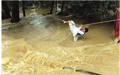 男子通過救生繩渡過洪水安全逃生