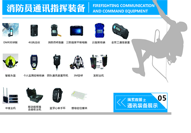 消防員通訊指揮裝備:DMR對講版,4G執(zhí)法儀,消防員呼救器,三防指揮平板電腦,云指揮終端,全雙工通信裝置,智能頭盔,個(gè)人監(jiān)測控制終端,團(tuán)隊(duì)通訊裝置耳機(jī),3M空呼,發(fā)射主機(jī),中繼主機(jī),移動(dòng)指揮箱含接收主機(jī),藍(lán)牙心率手環(huán),慣導(dǎo)定位模塊。