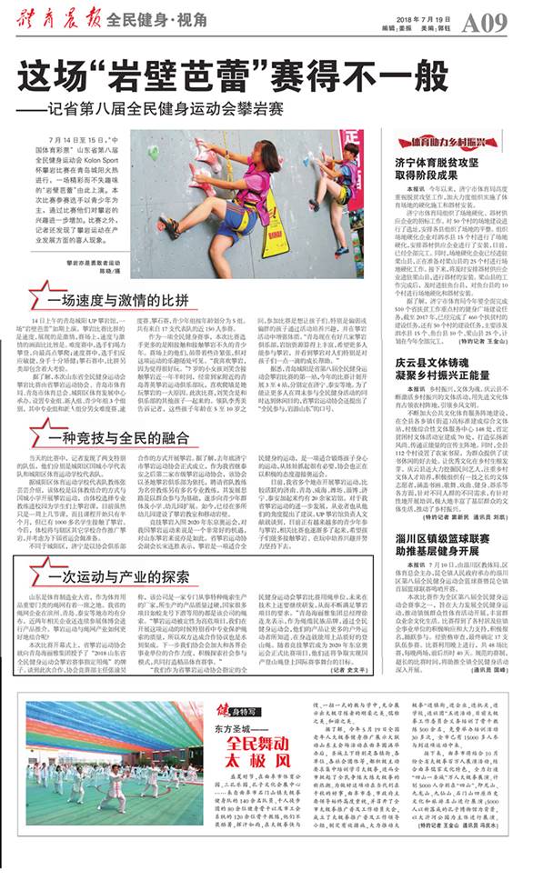 《體育晨報(bào)》以“這場(chǎng)巖壁芭蕾賽的不一般”為題,對(duì)青島海麗雅集團(tuán)研發(fā)生產(chǎn)的“蛟龍”動(dòng)力繩成為2018山東省全民健身運(yùn)動(dòng)會(huì)攀巖賽事唯一指定用繩等內(nèi)容進(jìn)行報(bào)道。