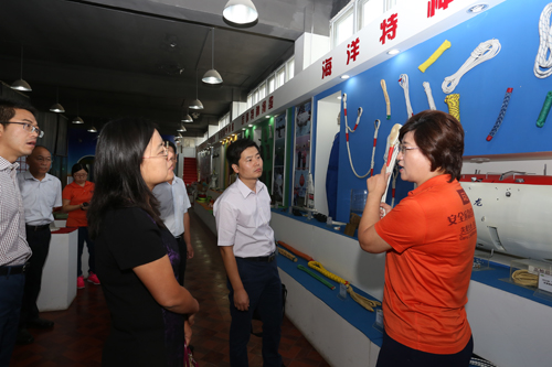 海麗雅集團(tuán)副總經(jīng)理、研發(fā)中心主任黃濤為陳黎明秘書(shū)一行匯報(bào)了企業(yè)質(zhì)量管理工作執(zhí)行情況:長(zhǎng)期以來(lái),在各級(jí)技術(shù)監(jiān)督部門(mén)的關(guān)心指導(dǎo)下,海麗雅集團(tuán)堅(jiān)持質(zhì)量強(qiáng)企,通過(guò)導(dǎo)入“卓越績(jī)效體系”、“ISO9001”、“CCC認(rèn)證”等管理體系,實(shí)行“首席質(zhì)量官制度”、“質(zhì)量基金制度”、“董事長(zhǎng)基金制度”,開(kāi)展QC小組、五小(小建議、小革新、小攻關(guān)、小發(fā)明、小創(chuàng)造)等全體職工范圍的質(zhì)量管理活動(dòng),打牢質(zhì)量基礎(chǔ),提高質(zhì)量管理水平,實(shí)現(xiàn)了質(zhì)量和經(jīng)濟(jì)效益雙提升。公司相繼為國(guó)家載人潛水器“蛟龍?zhí)枴?、?guó)家海洋科考船“大洋一號(hào)”、“科學(xué)號(hào)”配套特種繩纜,打破了國(guó)外壟斷局面。2016年8月,我國(guó)深海科考進(jìn)入“萬(wàn)米時(shí)代”,本次科考中,公司為海底探測(cè)地震儀布放配套特種繩纜,并成功獲取完整地震剖面,保護(hù)了國(guó)家科研成果。在產(chǎn)品展廳,海麗雅集團(tuán)董事長(zhǎng)張旭明為陳黎明秘書(shū)一行展示了這些海洋科考的“功臣”繩纜。此外,董事長(zhǎng)張旭明為調(diào)研領(lǐng)導(dǎo)介紹了應(yīng)急產(chǎn)品及“體驗(yàn)式”應(yīng)急安全培訓(xùn)的創(chuàng)新發(fā)展成果。