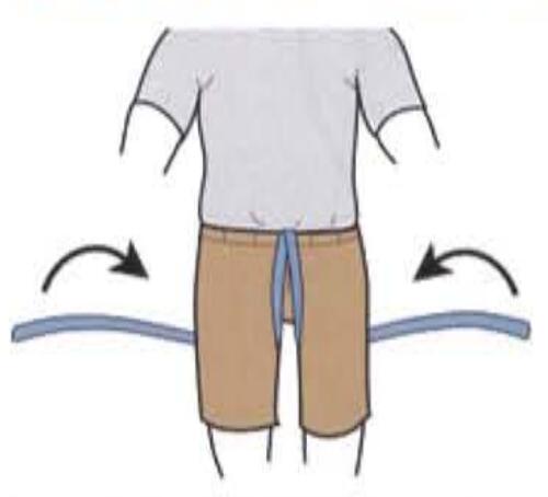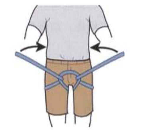 把織帶的兩端向外拉,然后纏到身后。用力拉緊吊帶以便簡(jiǎn)易安全吊帶在懸吊時(shí)更舒適。將剩余的織帶纏在身上,纏完為止。