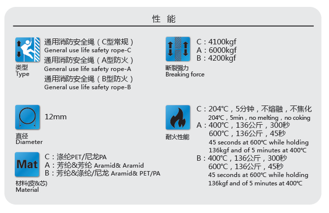 斷裂強(qiáng)度大于2000kgf,低延伸率,特殊防火設(shè)計(jì),400℃,136公斤,300秒;600℃,136公斤,45秒不出現(xiàn)斷裂現(xiàn)象。適用于消防、救援、火災(zāi)逃生、高溫環(huán)境作業(yè)等。